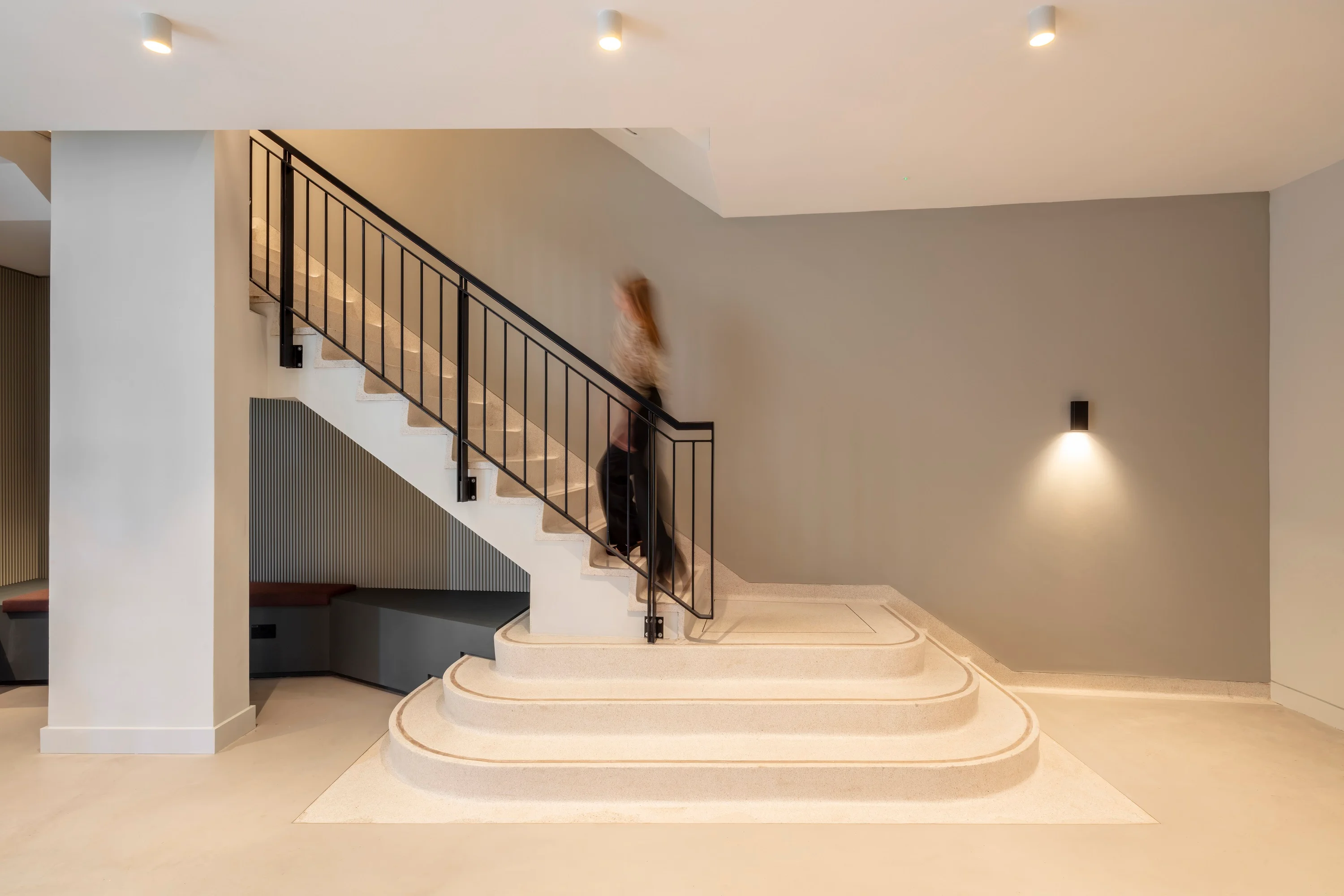 The existing terrazzo staircase was retained and refurbished. The new tunnel feature in the reception area provides the link between both entrances, connecting the two wings of the building.