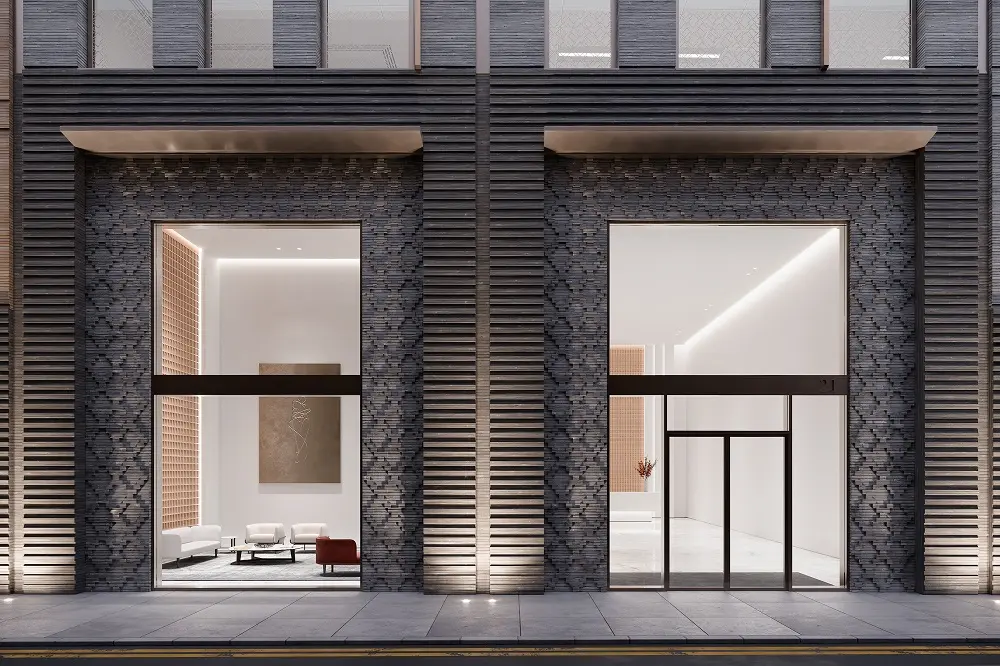 Within the lower brick massing the structural bays are expressed with recessed metal-clad vertical strips breaking the elevations into vertical bays that respond to the proportions of the typical Georgian plots in Fitzrovia.