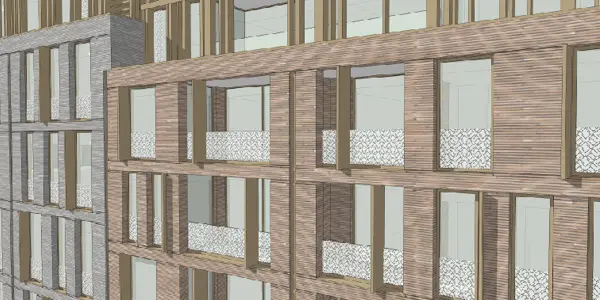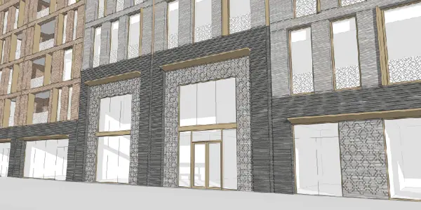 The selection of materials both contrasts and compliments each other, with subtly projecting metal cladding accents within the brick block fenestration creating a visual reference to the architectural language above.