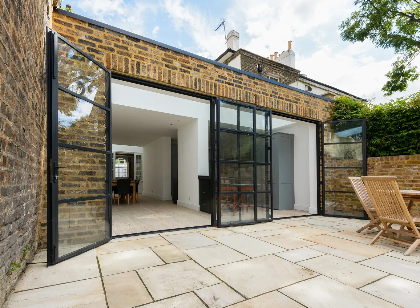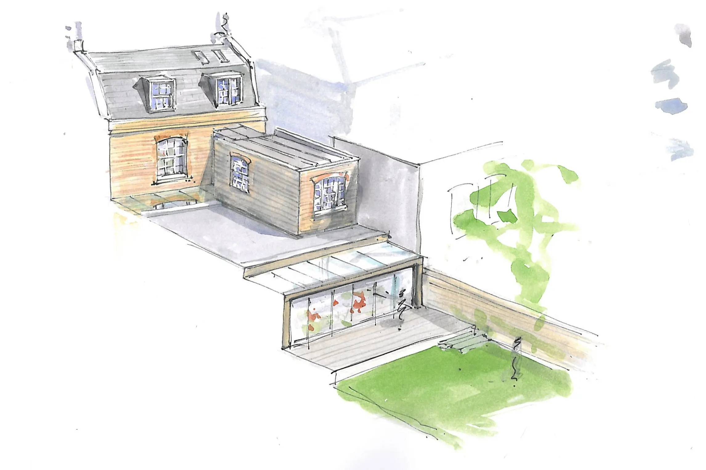 The partially reconstructed ground floor extension is spaced away from the lodge by a clear glass roof whilst the original service wing wall line was preserved and extended backwards, clarifying its original relationship with the Lodge.