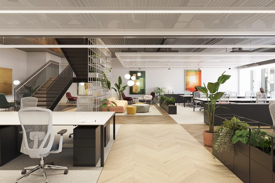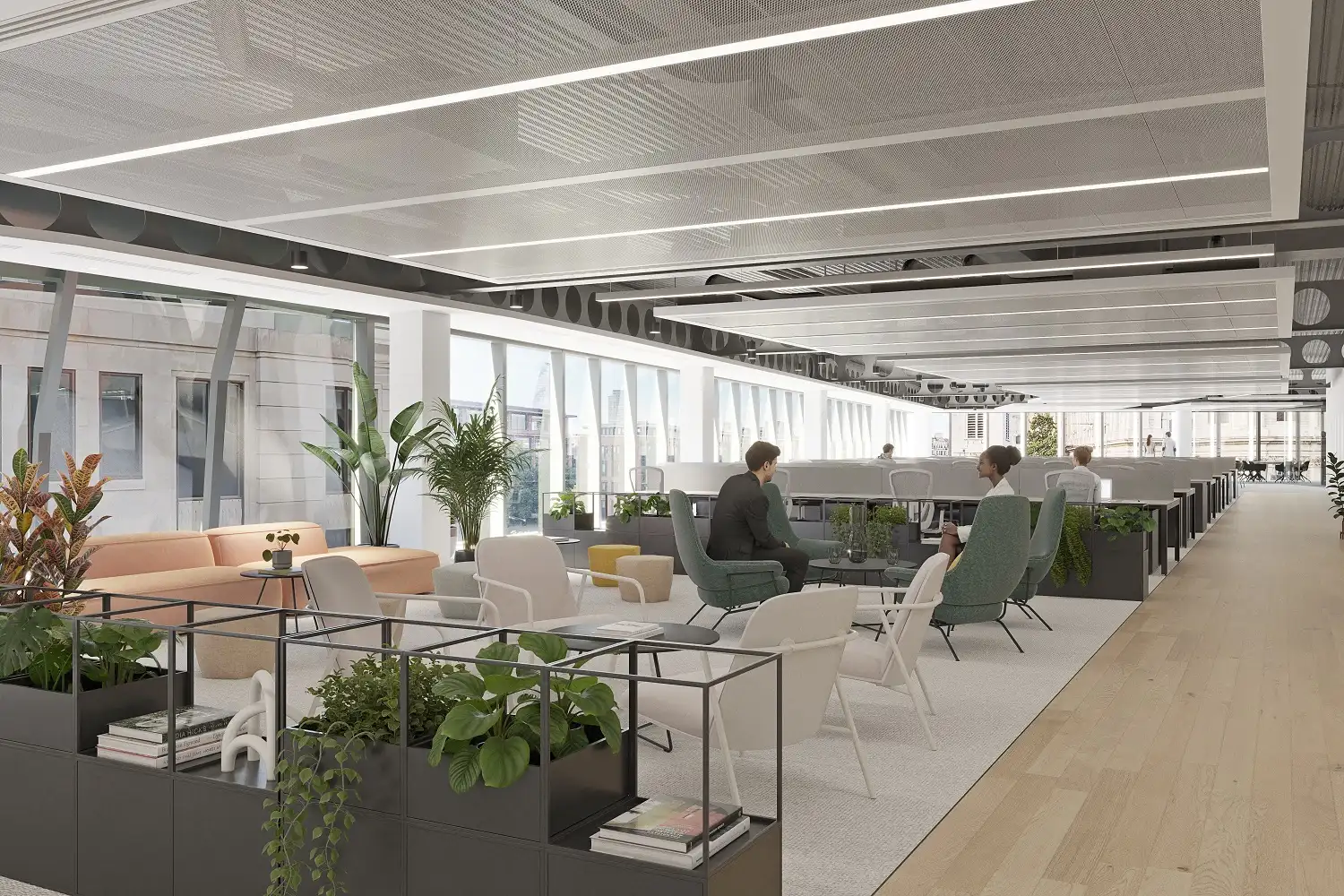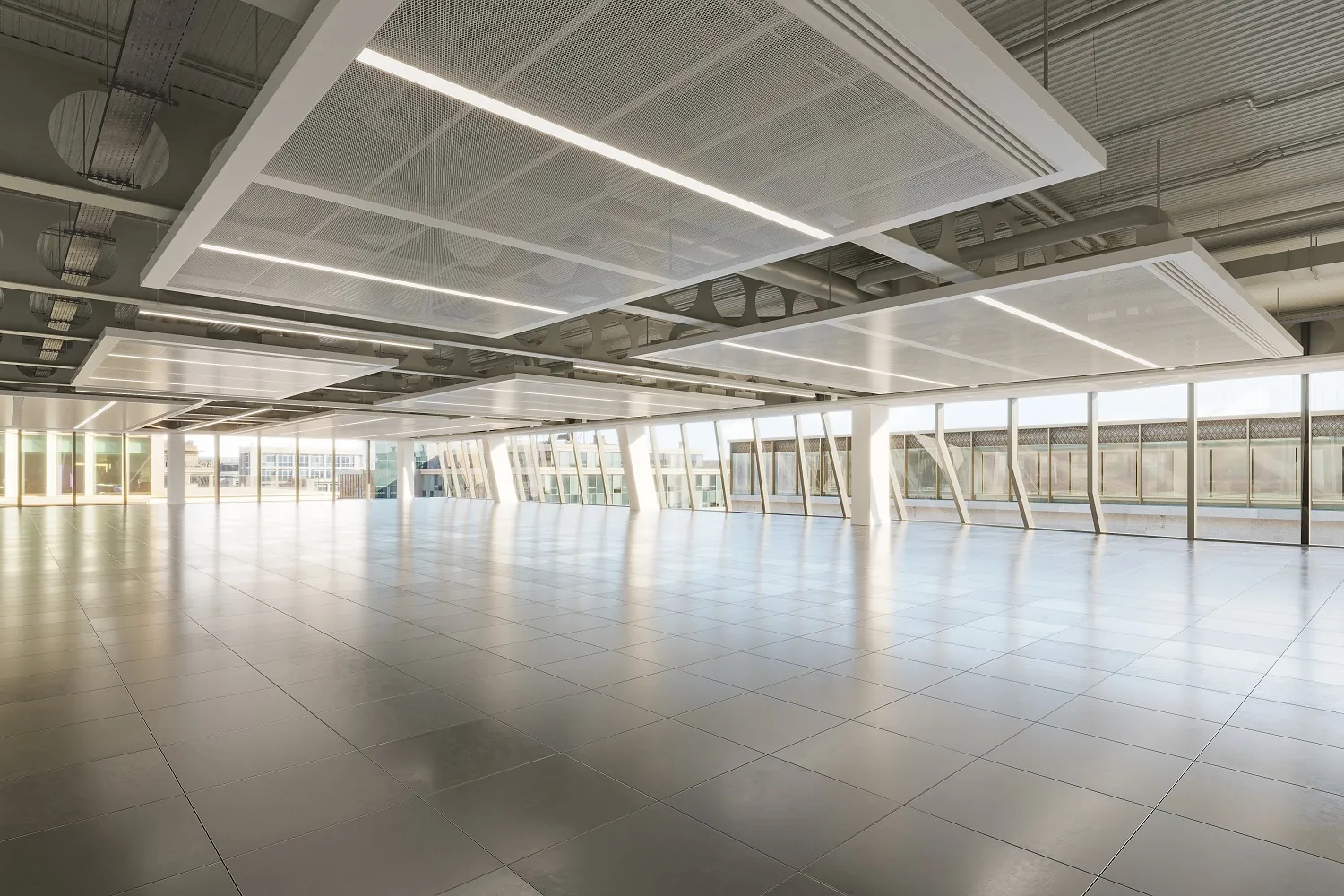 A complete reinterpretation of the previously ‘traditional’ CAT A fit out to the office floor plates at One New Change, incorporating mesh tiled ceiling systems with integrated lighting and the exposing of the original bespoke structural frame.