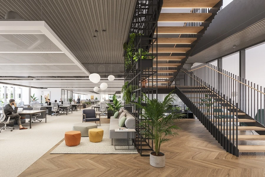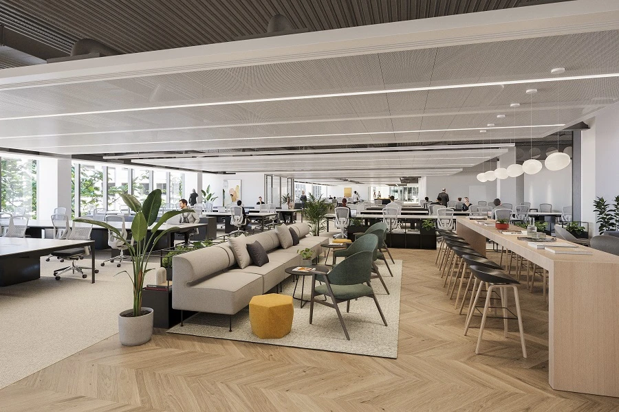 At ONC we created a modular CAT A ceiling design with the intention it could be replicated and adjusted to fit other levels throughout the building. The challenge of designing the mesh ceiling rafts was to integrate them successfully with the sharp angles and geometries of Jean Nouvel’s original building design, complementing the modern, sleek architecture of the external form.