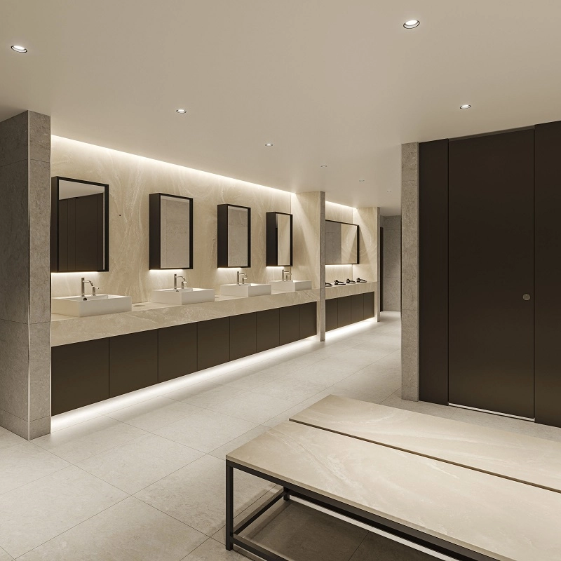 Full re-design of the WCs and end-of-trip facilities as part of a re-branding strategy using the colour tones from the external facade with stainless-steel highlights.